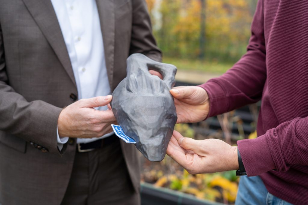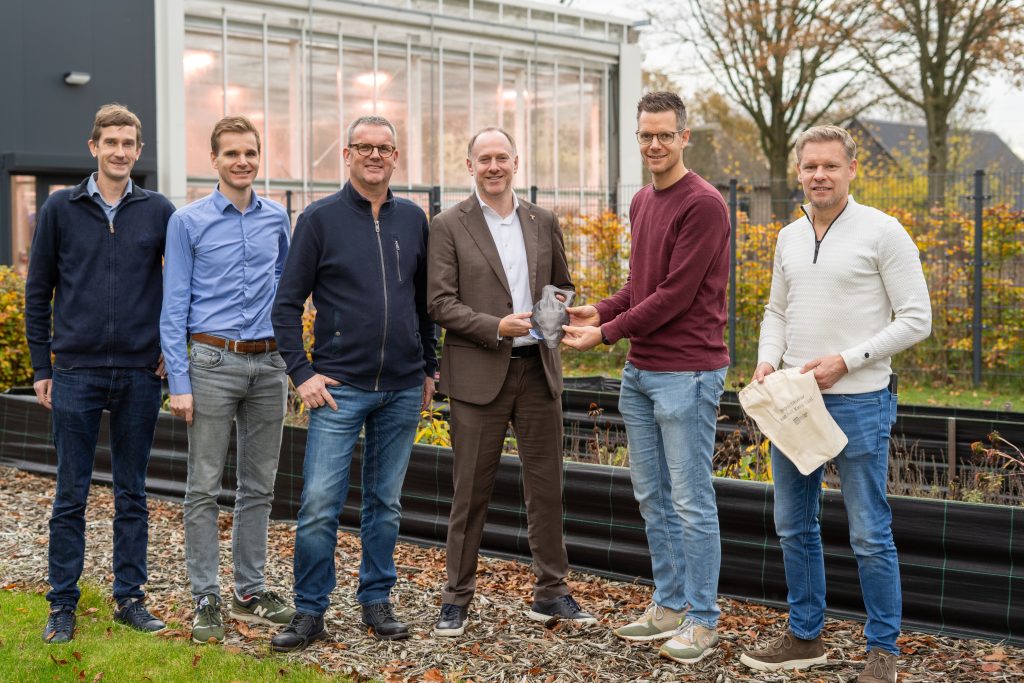 Fotobijschrift: Wethouder Bas van der Pol overhandigt de Impact Award aan Van Iersel Groenrecycling met van links naar rechts: Thomas Gillis (MT Soiltech), Freek van Iersel (MT Soiltech), Edwin van Iersel (directie Van Iersel groep), wethouder Bas van der Pol (gemeente Tilburg), Bram van Iersel (directie Van Iersel groep), Mark van Iersel (directie Van Iersel groep). Afwezig: David Damminga (MT Soiltech)